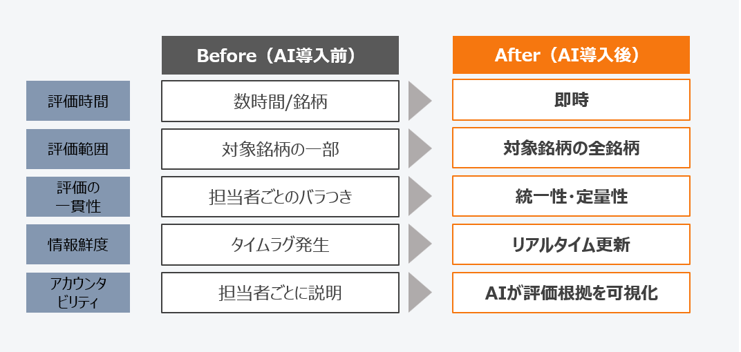 調査できる企業の数、評価判断の統一性が大幅に向上し、社内への波及効果も生まれる