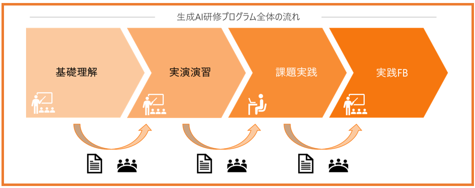 本プログラムは、一度の研修で完結させず、「基礎理解→実演演習→課題実践→実践FB」の4フェーズを通じて段階的に習熟を深める構成となっています。